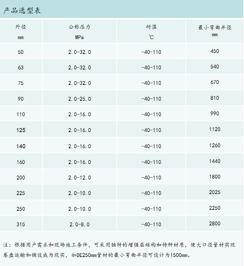 1、內芯管:混煉擠出成型,根據不同礦化度/不同化學成分/不同輸送溫度的流體介質,科學設計材料配伍,可采用PE/PE-T/PEX/PP-R/PB/PVDF/UHMWPE等
